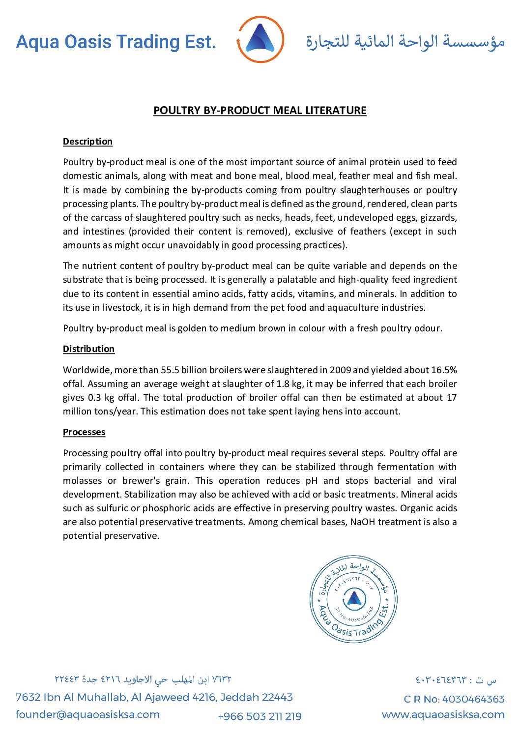 Poultry Meal is one of the most important source of animal protein. It is made by combining the by-products coming from poultry slaughterhouses or poultry processing plants. Poultry Meal is manufactured from ground, rendered, clean parts of the carcass of slaughtered poultry such as necks, heads, feet, undeveloped eggs, gizzards and intestines (provided their content is removed), exclusive of feathers.